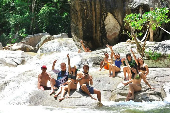 Dopo ci siamo persi tra i sentieri del giardino. Alcuni tratti sono così ombrosi che sembra crepuscolo anche a mezzogiorno — un sollievo fresco dal sole che rimbalza sulle pietre del fiume. C’erano famiglie ovunque: bambini che si sfidavano sui ponti sospesi, coppie sdraiate sotto gli alberi con i piedi nell’acqua. A un certo punto abbiamo visto un gruppo di locali scivolare su una scivolo naturale di roccia dentro una pozza d’acqua. Qualcuno ci ha offerto fette di mango spolverate di chili (quel sapore me lo porto ancora dietro). Il parco sembrava vivo ma mai affollato — forse perché ognuno trova il suo angolo speciale qui.