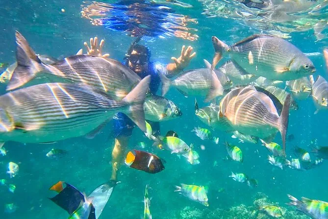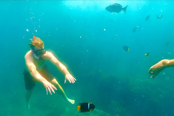Dopo quella scarica di adrenalina, Marco ha distribuito le maschere e ci siamo immersi proprio sotto gli archi di Los Arcos — sono molto più grandi da vicino di quanto sembrino dalla riva. I pesci nuotavano ovunque; per lo più gialli, ma anche con striature blu elettrico che non riuscivo a riconoscere (Marco ha provato a spiegarmelo, ma l’ho subito dimenticato). A volte intravedevi un lampo d’argento o un’ombra che ti faceva chiedere cos’altro si nascondesse laggiù. Sott’acqua è tutto più silenzioso, quasi rilassante, a parte il rumore delle tue bolle e il lontano passaggio di un’altra barca. A un certo punto ho guardato su attraverso un arco e ho visto dei pellicani volteggiare nel cielo — un’immagine stranamente rasserenante.