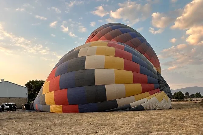 Ricordo a malapena il viaggio fuori da Città del Messico — era ancora buio quando ci hanno preso (credo fosse più vicino alle 4:30 che alle 5), e ho passato il tempo a guardare le luci della città sfumare fuori dal finestrino. Quando siamo arrivati a Teotihuacan, c’era un silenzio strano, come se tutti sapessero che stava per succedere qualcosa di speciale. La nostra guida, Ana, ci ha offerto caffè e biscotti su una terrazza mentre il team preparava le mongolfiere. Odorava di aria fresca del mattino mescolata a dolci appena sfornati. Continuavo a giocherellare con la macchina fotografica, ma davvero, nulla ti prepara al momento in cui la mongolfiera si solleva.
