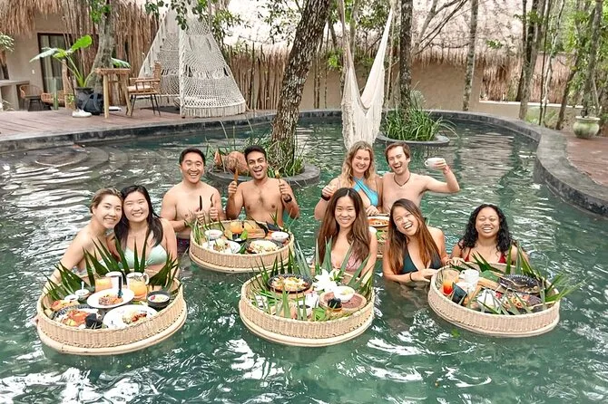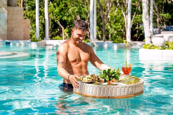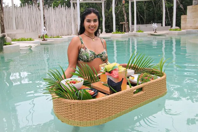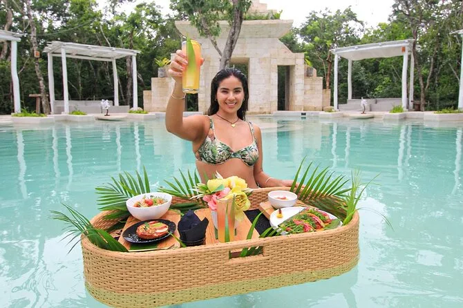 La tua giornata include pickup all’ingresso del Cenote Dos Ojos se richiesto, un drink di benvenuto preparato da mixologist locali all’arrivo, accesso completo alle aree comuni dalla mattina alla sera, la colazione gourmet galleggiante dello chef Julio in piscina (uova a scelta, chilaquiles regionali, fagioli, frutta fresca con bagel), caffè o tè a piacere, più una sessione guidata di meditazione nel temazcal di 20-25 minuti immersi nell’aria della giungla, prima di tornare quando vuoi.