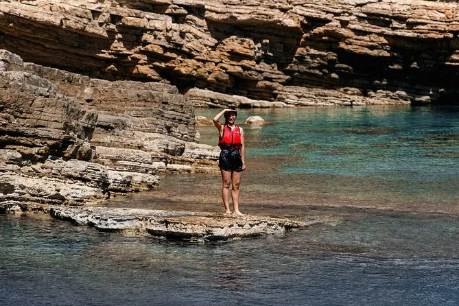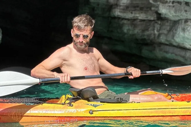La grotta era più buia di quanto immaginassi — fresca dentro, con echi quando parlavamo. Marko ci ha raccontato storie di contrabbandieri che usavano questi passaggi secoli fa; ci ha anche mostrato dove le vecchie corde avevano scavato solchi nella roccia. L’odore era di pietra bagnata e alghe, sembra strano ma dopo tutto quel sole fuori era quasi rassicurante. Al ritorno ci siamo fermati a Calypso Beach — solo scogliere, ciottoli e un’acqua così blu da sembrare finta. Mi sono sdraiato su una roccia calda ad ascoltare una playlist che arrivava da un altro kayak, quasi addormentato, senza voglia di andarmene.