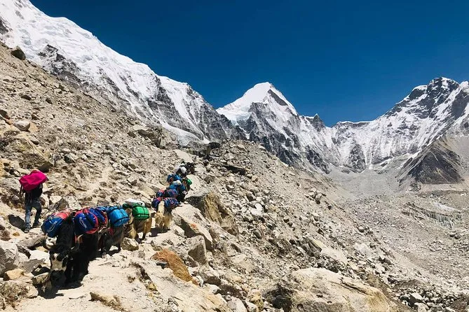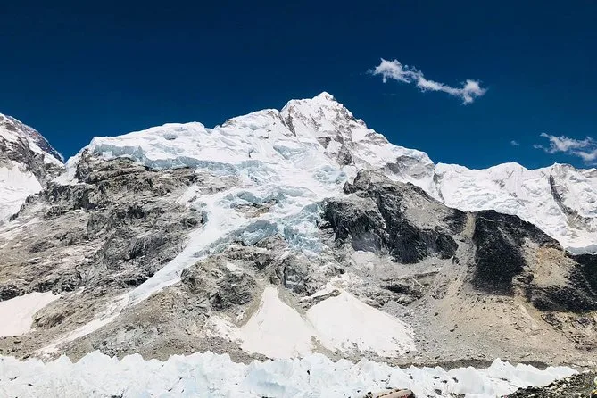 Lobuche sembrava quasi lunare—terreno roccioso, aria rarefatta, quasi nulla cresce qui tranne piccoli fiori viola che spuntano tra la ghiaia a giugno. L’ultimo tratto verso il Campo Base segue il ghiacciaio Khumbu; passerai tra bandiere di preghiera svolazzanti nel vento gelido e vedrai le tende degli alpinisti sotto enormi cascate di ghiaccio. In realtà, stare al campo base non ti regala una vista perfetta dell’Everest (quella arriva dopo), ma guardare giù nella valle circondata da quelle vette è qualcosa di unico.