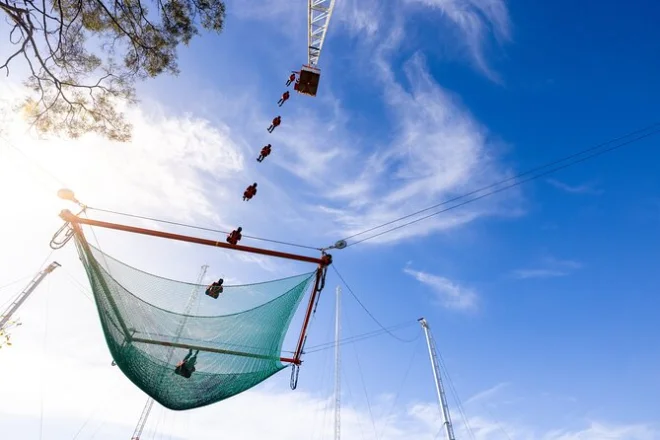 Dopo è arrivato Agrojet, un’altra storia. Sei seduto basso nella barca, la spruzzata d’acqua ti gela la faccia mentre il pilota sfreccia in curve strette — 100 km/h sembrano molto di più quando sei così vicino all’acqua. Le mani mi facevano male a stringere il manubrio ma non riuscivo a smettere di sorridere. E poi Vertigo… beh, quella è un’altra storia. È una caduta libera di 43 metri dentro una rete gigante che sembra un trampolino. Niente imbrago, niente elastico — solo gravità e coraggio. Stare sul bordo sembrava irreale; le gambe tremavano ma alla fine ho saltato. Per un attimo senti solo il vento nelle orecchie, poi il rimbalzo — un sollievo selvaggio e sicuro.