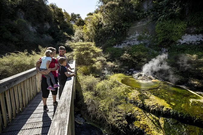 Il tuo giorno include l’ingresso alla Waimangu Volcanic Valley con guida cartacea per camminata autonoma, accesso a tutti i sentieri principali al tuo ritmo, uso della navetta interna climatizzata per il ritorno e personale disponibile per ogni domanda lungo il percorso.