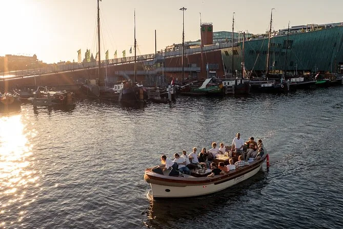 Il tuo giorno include due ore di navigazione nei canali di Amsterdam a bordo di una comoda barca elettrica con sedili imbottiti, guida dal vivo di uno skipper locale esperto, snack classici olandesi come stroopwafel e formaggio offerti durante il percorso, più accesso a un bar completo per acquistare bevande, con conclusione vicino alla Stazione Centrale.