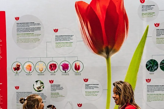 Il tuo giorno include pickup e ritorno in hotel ad Amsterdam con veicolo Mercedes privato, biglietti salta fila per il museo Tulip Experience e i Giardini di Keukenhof, audioguida opzionale al museo, acqua in bottiglia e wifi a bordo, più la possibilità di raccogliere un mazzo di tulipani freschi prima di tornare a casa.
