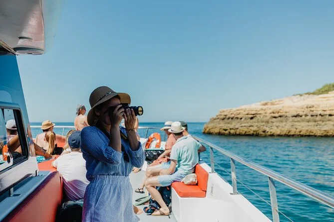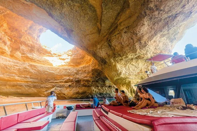 Partirai da Albufeira a bordo di un catamarano moderno seguendo la costa dell’Algarve fino alla famosa grotta di Benagil, con soste per ammirare calette nascoste e magari fare un bagno se ti va. Guide amichevoli raccontano storie mentre navighi tra scogliere illuminate dal sole — non è solo una gita, è quella sensazione di sale sulla pelle e risate che si perdono sull’acqua.