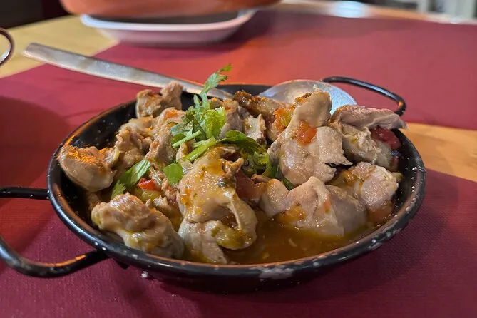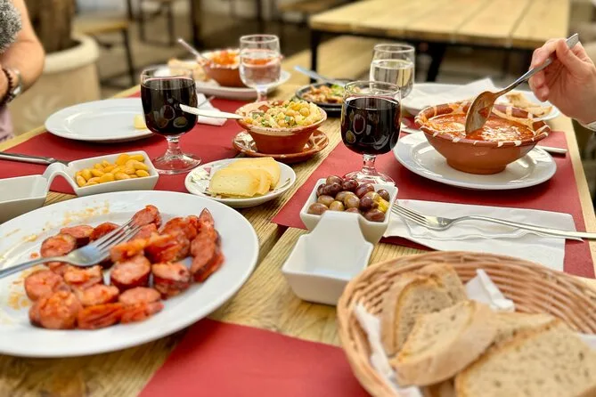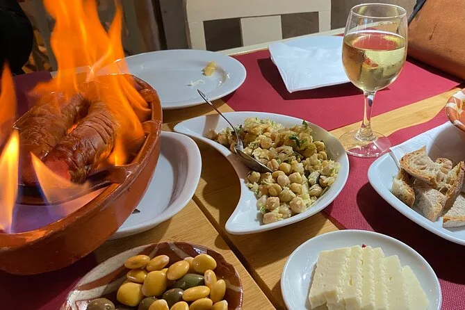 Assaggerai panini di maiale, frittelle di baccalà, insalata di ceci con baccalà, formaggio, pane, olive, lupini, samosa, chorizo, zuppa e torta alla crema.