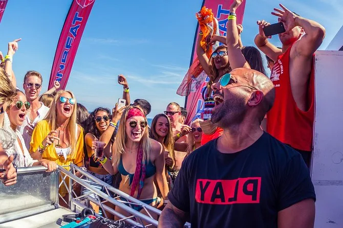 Il pomeriggio include l’ingresso a una festa in barca di 3 ore con partenza da Playa d’en Bossa, drink alcolici illimitati come birra e sangria, bibite analcoliche e acqua; hot dog serviti a bordo; una vivace sosta bagno in acque limpide del Mediterraneo; intrattenimento con DJ dal vivo e ballerine go-go; momenti di festa con spruzzi di champagne; staff professionale che garantisce sicurezza e divertimento per tutta la durata del tour prima del rientro a terra.