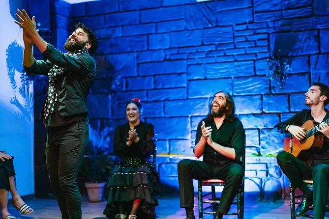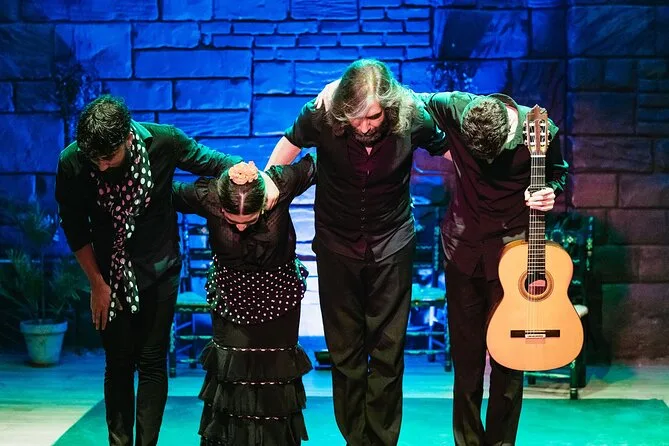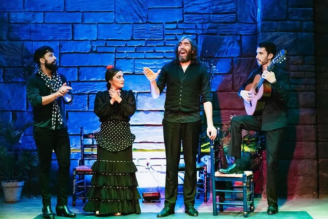 La tua serata include l’ingresso al Baraka Sala Flamenca a Triana con uno spettacolo flamenco tradizionale eseguito da quattro artisti locali, più la scelta tra vino, birra o bibita all’arrivo — se vuoi, puoi acquistare altri drink al bar.