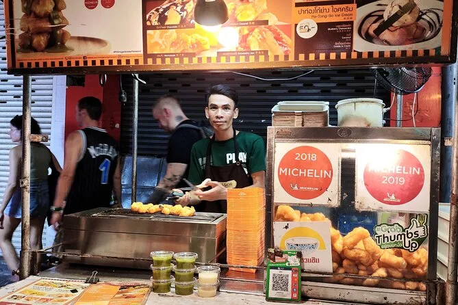 La tua serata comprende il pickup in tuk tuk dal tuo hotel, tutti gli spostamenti tra le tappe, l’ingresso in ogni locale consigliato dalla guida Michelin, dieci o più piatti unici (inclusi mango sticky rice e pad thai affumicato), bevande come il tè alle erbe a Chinatown, e il ritorno in hotel—il tutto guidato da un esperto foodie di lingua inglese che mantiene il ritmo e il divertimento.