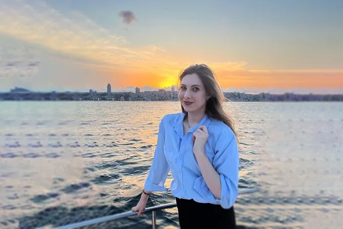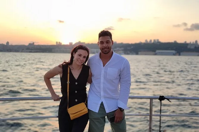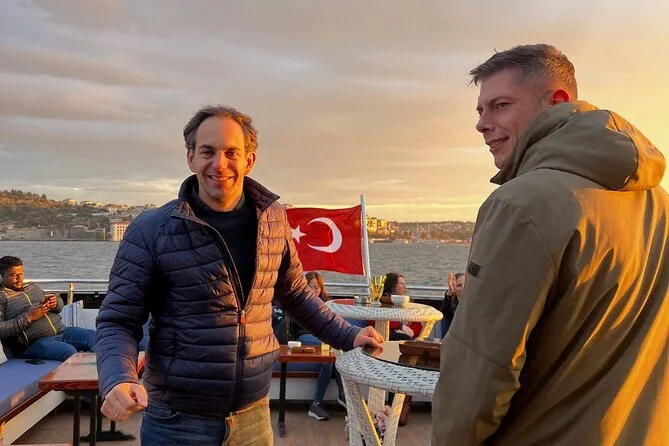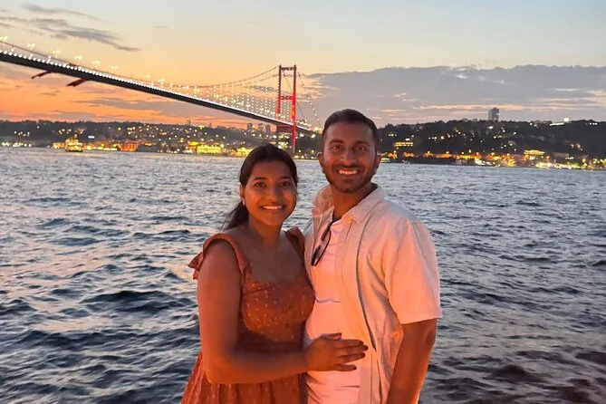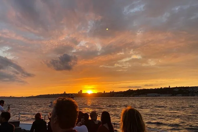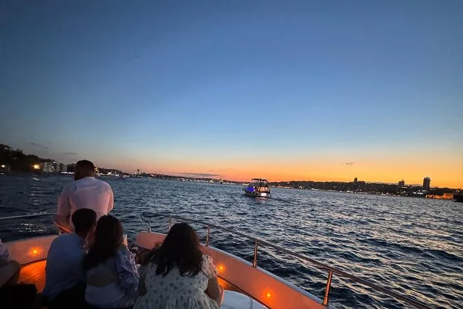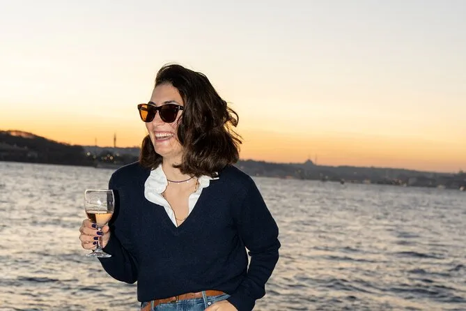 La tua serata include l’imbarco su uno yacht di lusso per una crociera guidata di 2 ore e 15 minuti lungo entrambe le sponde dello Stretto del Bosforo, con due bicchieri di vino a persona (o bevande analcoliche come tè o limonata) e snack leggeri come frutta secca e pretzel serviti durante il percorso. Una guida in inglese racconta storie mentre passi davanti a palazzi e monumenti della città, per poi tornare al porto dopo il tramonto.