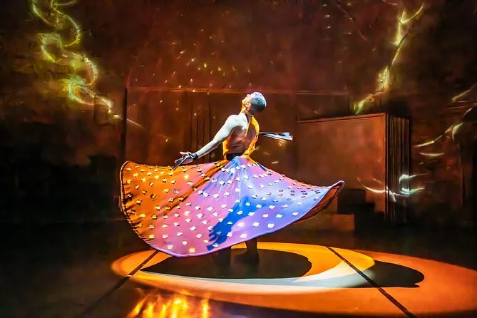Quando lo spettacolo è iniziato, era quasi troppo da assorbire tutto insieme. I danzatori ruotavano in esplosioni di colore—rossi vellutati, blu profondi—e i loro piedi battevano sul pavimento così forte che lo sentivi nel petto. A un certo punto, una danzatrice solista di danza del ventre si muoveva con una sicurezza silenziosa; i suoi braccialetti tintinnavano a ogni torsione. Le proiezioni video a 360 gradi ci avvolgevano—montagne, fiumi, luci della città—e per un attimo ho dimenticato che eravamo appena fuori da una strada trafficata di Istanbul. La nostra guida (credo si chiamasse Emre?) si è chinato e ha sussurrato qualche dettaglio—come certi passi provenissero da villaggi vicino al Mar Nero. Non mi aspettavo di avere i brividi durante una danza di gruppo, ma è successo.
