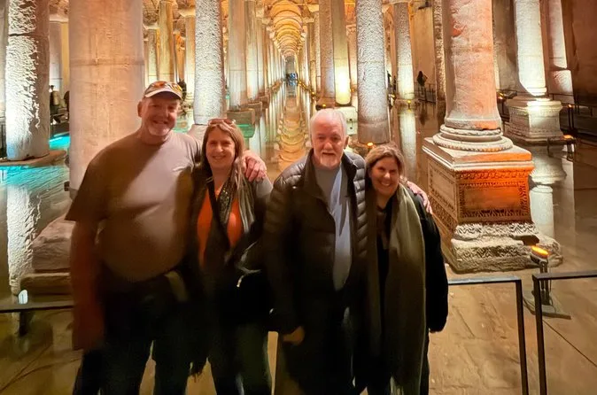 La Cisterna Basilica è stata la tappa successiva — si scende una scala scivolosa in una sorta di foresta sotterranea di colonne. Fa freddo e l’eco rimbomba; gocce d’acqua cadono da qualche parte nel buio. Ho provato a fare una foto ma sono venute solo ombre sfocate. Poi il Palazzo Topkapi — giardini vasti, vetrine piene di spade e gioielli (tantissimi anelli), e finestre che si affacciano sul Bosforo dove il vento quasi mi portava via il cappello. Murat raccontava storie di sultani che li facevano sembrare quasi persone normali — o almeno qualcuno che ha avuto anche giorni no.
