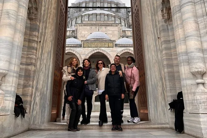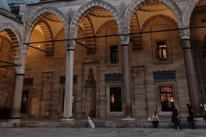 La Moschea Süleymaniye si trova sulla collina, e la passeggiata vale solo per il panorama. Si vede il Bosforo che scintilla in lontananza. All’interno è ariosa e tranquilla, con enormi cupole sopra la testa e la luce che filtra dalle vetrate colorate. Cem ci ha raccontato storie su Solimano il Magnifico e il suo architetto Sinan. I mausolei fuori sono più silenziosi di quanto ti aspetteresti; abbiamo visto alcuni locali lasciare fiori.