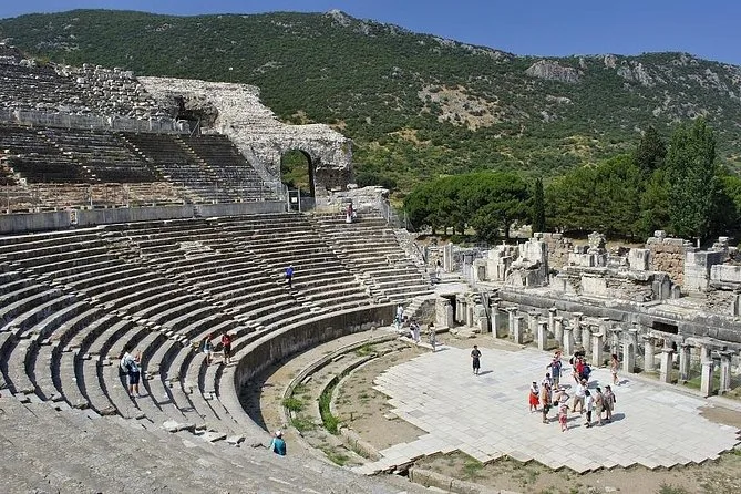 La prima cosa che si vede è la Porta di Magnesia—difficile immaginare quanto fosse trafficata secoli fa. Abbiamo iniziato la nostra discesa a piedi verso Efeso. Il marmo sotto i piedi era scivoloso in alcuni punti (attenzione se ha piovuto), e nell’aria si percepiva un leggero profumo di timo selvatico. Emre ci ha indicato delle incisioni sulla Biblioteca di Celso che da soli avremmo sicuramente perso—sapeva persino quali colonne erano originali. Il Grande Teatro è imponente; a quanto pare gli abitanti lo usano ancora per le feste di primavera. Se resti fermo abbastanza a lungo, puoi quasi sentire gli echi. Dopo aver vagato tra archi e antiche vie, siamo saliti fino alla Casa della Vergine Maria—un luogo tranquillo, ombreggiato dagli alberi, dove la gente accende candele in silenzio.