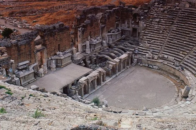 La mattina seguente è iniziata con un forte tè turco e pane fresco a colazione—semplice ma buono. Da Kuşadası a Pamukkale ci vogliono circa tre ore di viaggio, quindi porta qualche snack o prendi dei ceci tostati da un venditore lungo la strada, come ho fatto io quando mi è venuta fame. Avvicinandosi a Pamukkale, quelle terrazze bianche sembrano quasi irreali contro il cielo azzurro. Dopo il pranzo in un locale tipico (prova il loro gözleme), abbiamo esplorato Hierapolis: le rovine del ginnasio, un anfiteatro che poteva ospitare 15.000 persone (l’acustica è incredibile), e ciò che resta del Tempio di Apollo.
