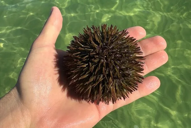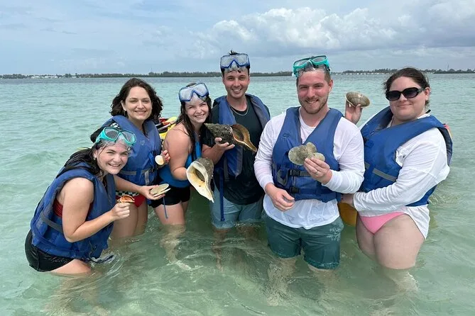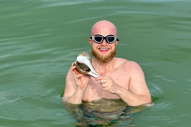Arrivare all’isola ha preso circa mezz’ora? Difficile dirlo—ero troppo impegnato a cercare i delfini (ne abbiamo visti altri due). Quando siamo sbarcati, la sabbia era calda e granulosa tra le dita dei piedi. Jamie ha distribuito maschere e boccagli (mi dimentico sempre quanto puzzano all’inizio) e siamo entrati in acqua. È più limpida di quanto pensi—un verde chiaro—e c’erano stelle marine appoggiate sul fondo, senza nemmeno cercare di nascondersi. Qualcuno ha trovato una conchiglia grande come una mano. Ancora adesso penso a quella vista sott’acqua: la luce del sole che danza su dollari di sabbia e granchi che corrono di lato.