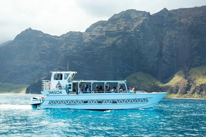 Scivola lungo la costa Na Pali di Kauai su un catamarano veloce con una guida locale che racconta leggende e storia. Aspettati spruzzi d’acqua, avvistamenti di delfini, scogliere spettacolari e grotte marine, più una cena informale mentre il cielo si tinge di colori al tramonto. Un’esperienza vivace, a volte un po’ frizzante, che ti fa sentire piccolo e fortunato.