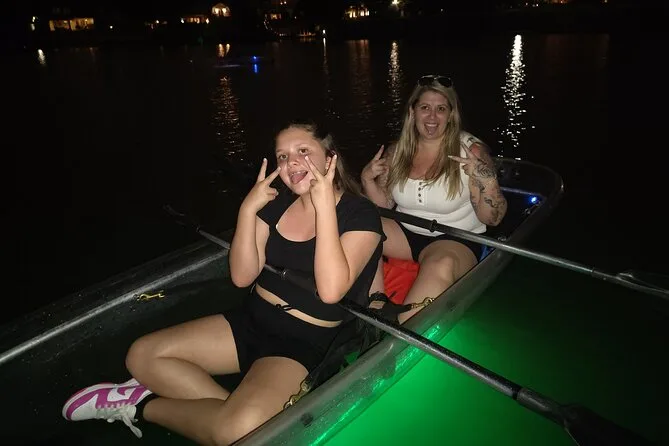 Ho scelto un kayak trasparente (la mia amica ha preferito il SUP — lei è più coraggiosa) e abbiamo fluttuato sopra queste macchie di piante sommerse che sotto le luci sembravano quasi finte. Il tour è pensato per principianti, ma io sono comunque riuscito a bagnarmi subito. Jamie ha riso e ha detto che succede a tutti la prima volta. Ci ha indicato qualche pesce che nuotava sotto di noi — onestamente, senza le luci non li avrei mai visti. C’erano anche un paio di locali che correvano lungo la riva; uno ci ha salutato come se fosse una serata normalissima.