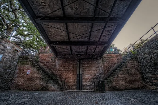 Siamo usciti nella calda notte di Savannah, bicchiere in mano (qui i go-cup sono legali — ancora mi stupisce). La tappa successiva è stata Factor’s Walk. È uno di quei posti dove i passi rimbombano strano tra i mattoni e quasi senti gli antichi marinai che ti osservano. Li ci ha indicato i ponti di ferro sopra di noi, raccontandoci di sparizioni misteriose; lo diceva con nonchalance, ma l’ho vista guardarsi più volte alle spalle. C’è stato un momento in un vicolo dove tutto è diventato silenzioso, tranne una risata lontana — quella scena mi è rimasta impressa più di ogni racconto di fantasmi.