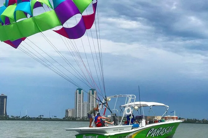 La tua giornata include tutte le tasse e i costi per l’avventura in parasailing sulla Laguna Madre — basta fare il check-in da SPI Excursions accanto al Lobo Del Mar Café prima dell’orario previsto e goderti la gita in barca con la crew locale che si occupa di tutto.