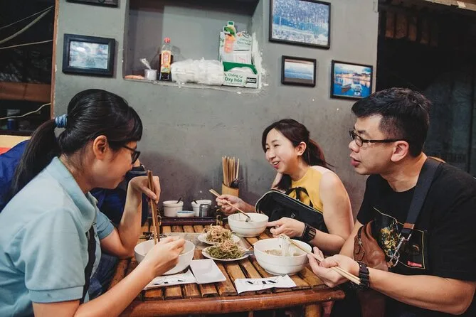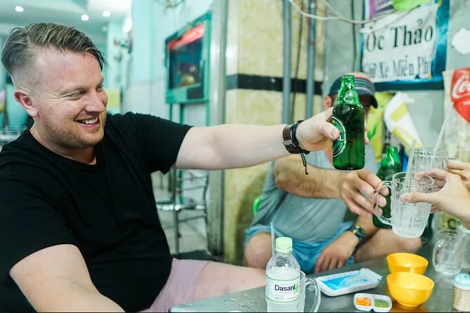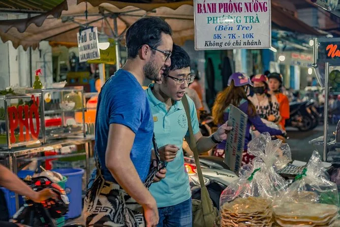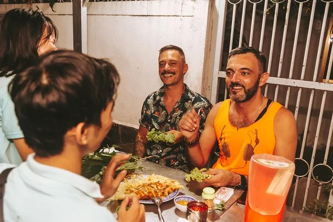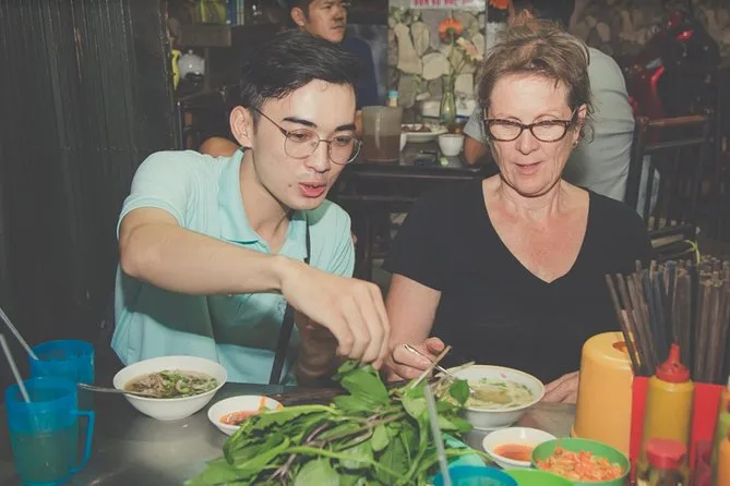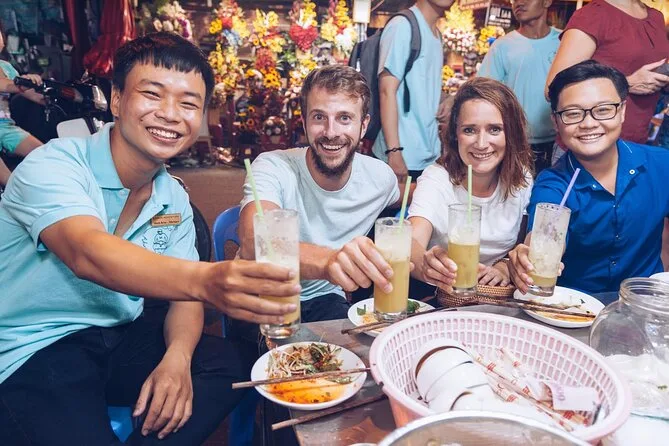 La tua serata include un giro come passeggero in motorino con carburante fornito (e poncho antipioggia se serve), soste in ristoranti locali per bun bo (con opzione vegetariana), pancake vietnamita e piatti di pesce, oltre a cracker di banana croccante e dessert. Avrai birra fredda o succhi di frutta e tè al gelsomino per tutta la serata—il tutto guidato da una guida locale che parla inglese e si occupa della navigazione così puoi goderti ogni attimo.