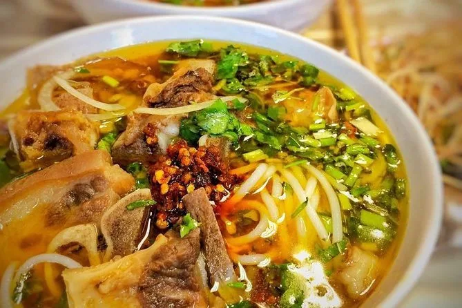 Assaggerai bun bo (zuppa di noodle di manzo), pancake vietnamita, involtini primavera, banh trang nuong, cracker di banana croccante, piatti di pesce, dessert e tè al gelsomino.