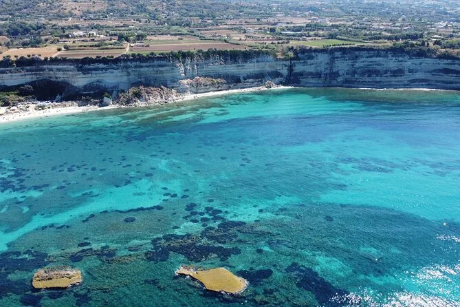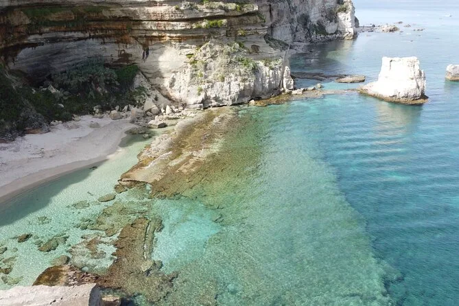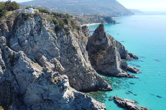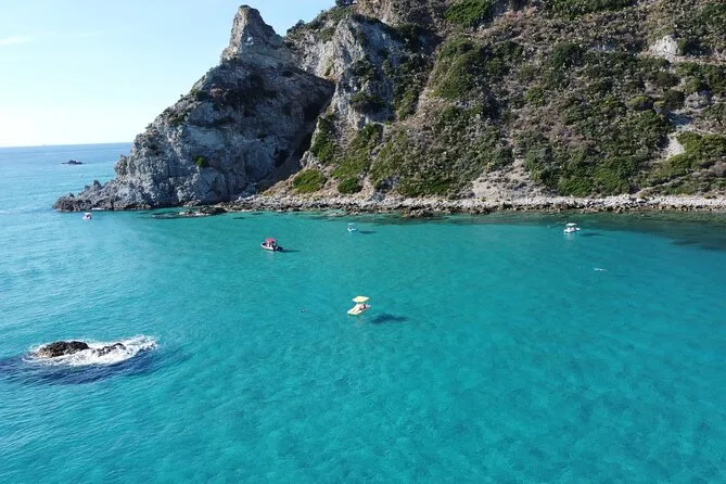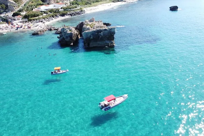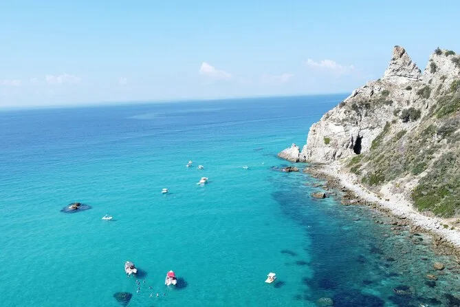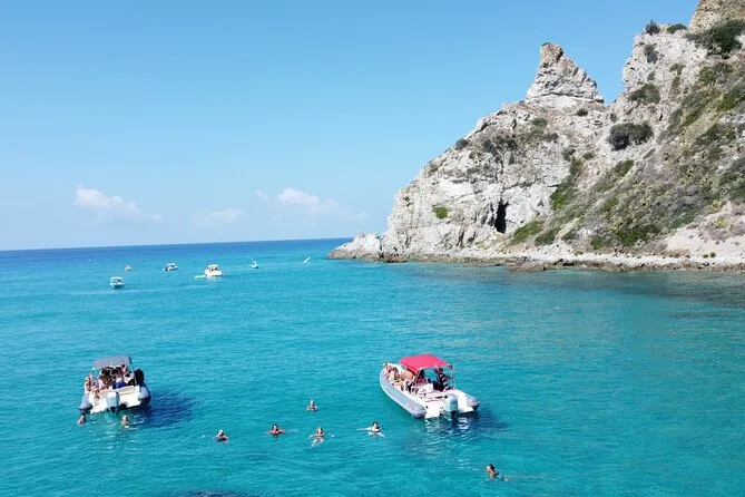 You’ll visit Grotticelle Bay, Praia i Focu beach (only reachable by sea), Grotta dello Skeleton cave, Riaci Bay, Formicoli ruins area, and see Tropea's cliffs and monastery.