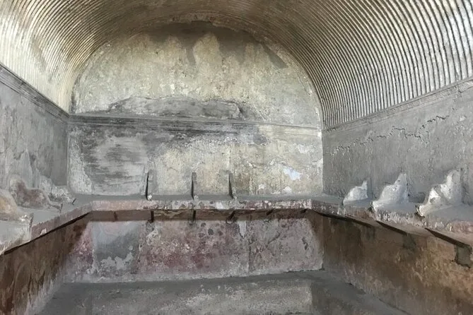 You’ll visit private houses like House of Neptune and Amphitrite, Roman shops, public baths, main streets, and the ancient beach area with preserved skeletons and a wooden boat.