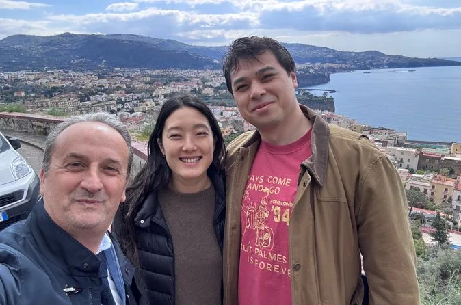 We set off toward Sorrento, weaving through the city’s busy streets before hitting the open road. The WiFi onboard was handy—I sent a few photos home while we passed rows of lemon trees and glimpses of the Gulf of Naples. At one point, our driver suggested a quick stop at a lookout. I’m glad we listened; the view over the Sorrento Peninsula is something you don’t forget easily, especially with that late afternoon haze softening everything. He pointed out Mount Vesuvius in the distance and shared a bit about local life—like how traffic can get wild during festival days.