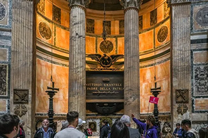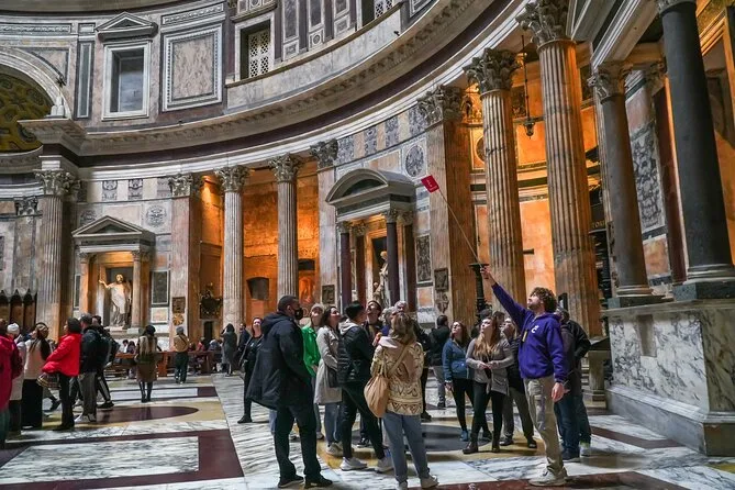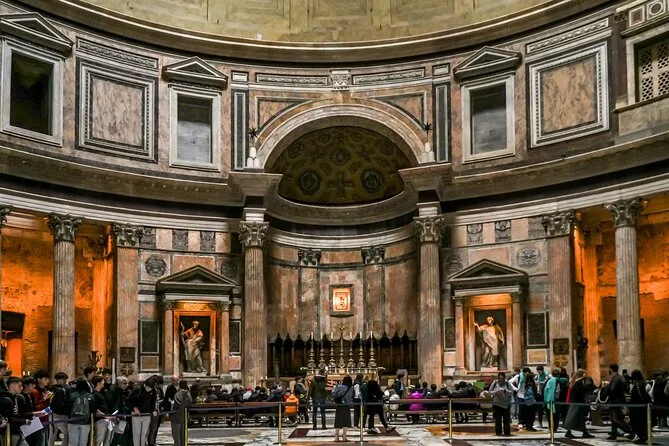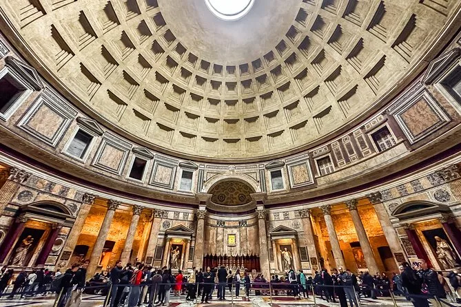 You’ll see the coffered dome, oculus, marble flooring, chapels, statues of Roman gods, and tombs including Raphael's.