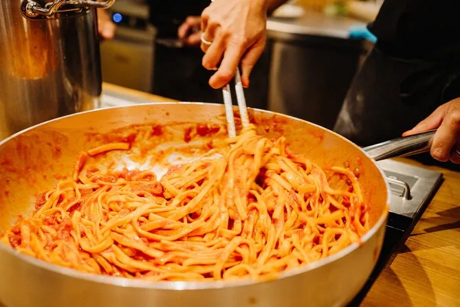 Your evening includes all fresh ingredients for two homemade pastas with traditional sauces, prosecco on arrival with Italian appetizers like cured meats and cheese, bottomless wine throughout your meal, homemade gelato for dessert, plus expert guidance from a local chef—all set within a welcoming kitchen space in Trastevere.