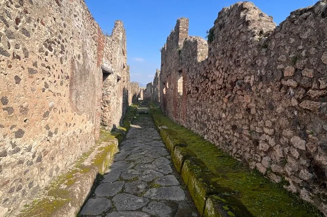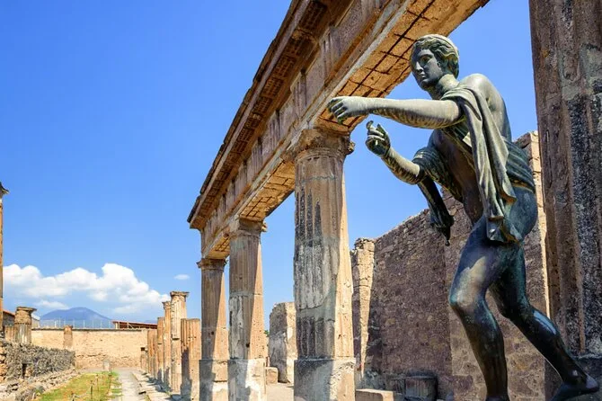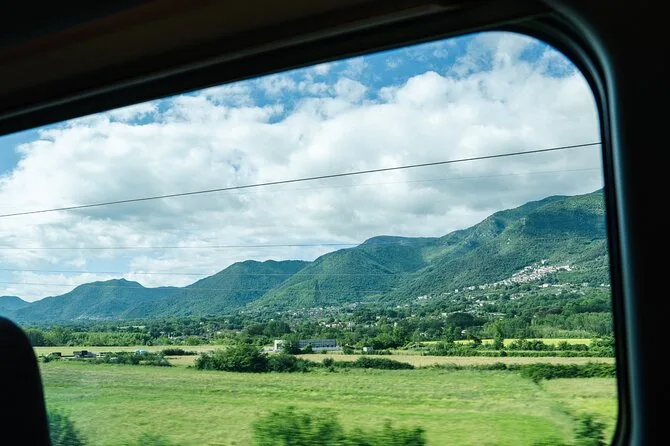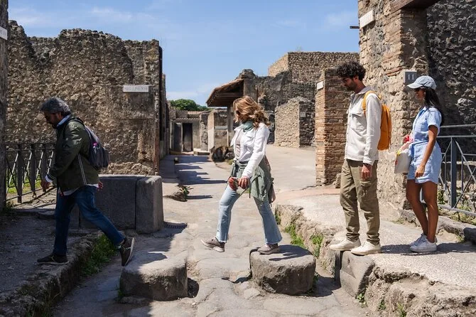 You’ll take a high-speed train from Rome to Naples (about 1 hour), then transfer by private coach to Pompeii (about 35 minutes).