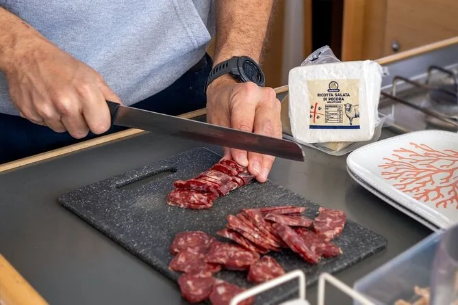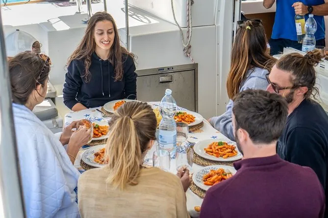 Yes, lunch is cooked on board with Sardinian fish dishes (vegetarian/no-fish option available if requested when booking).
