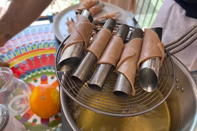 You learn how to make cannolo dough, prepare ricotta cream filling, fry shells, and assemble traditional Sicilian cannoli.