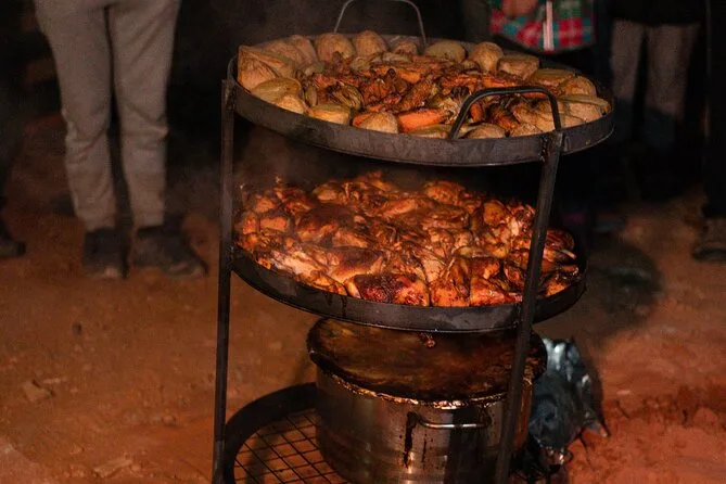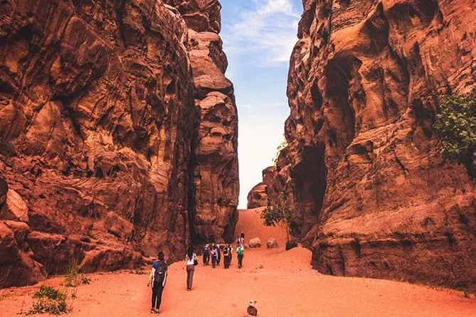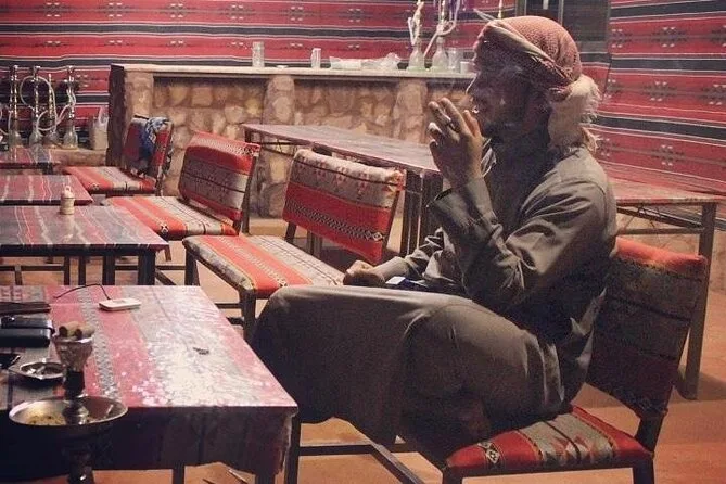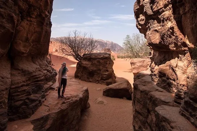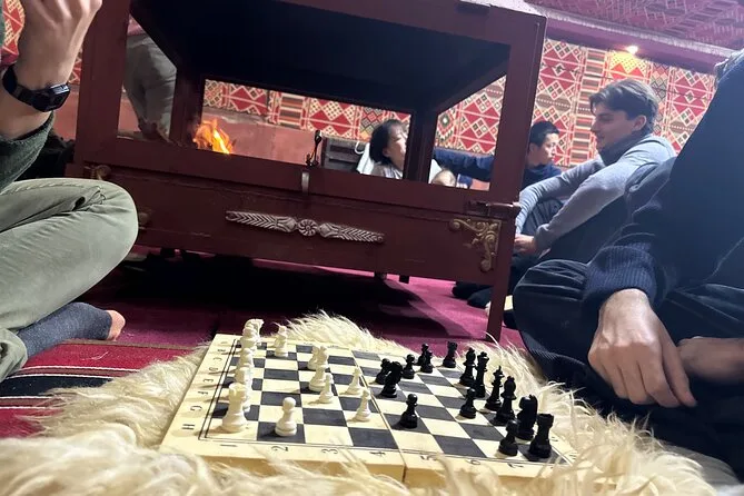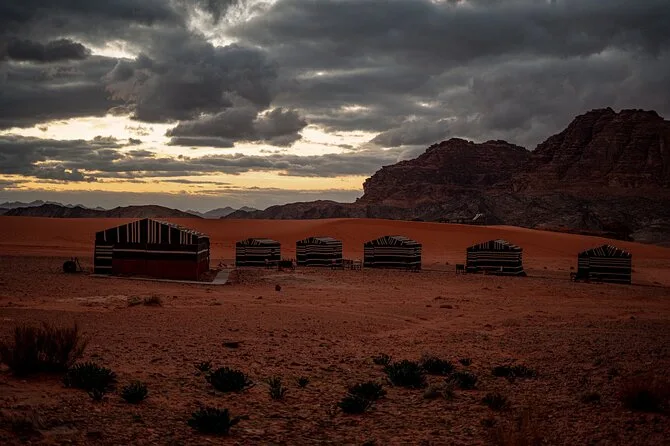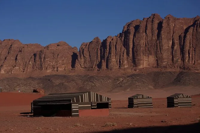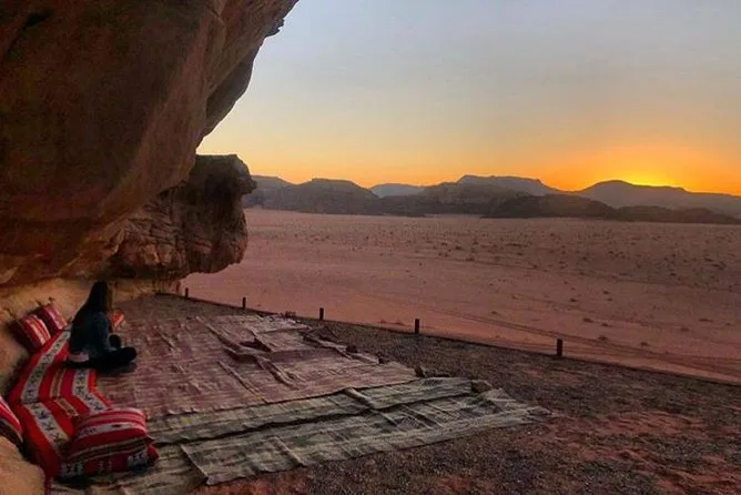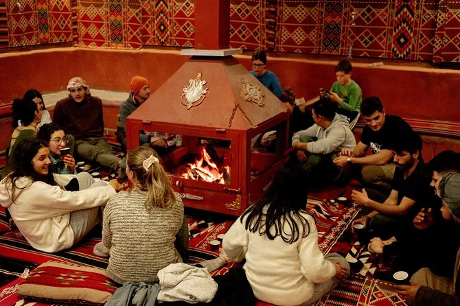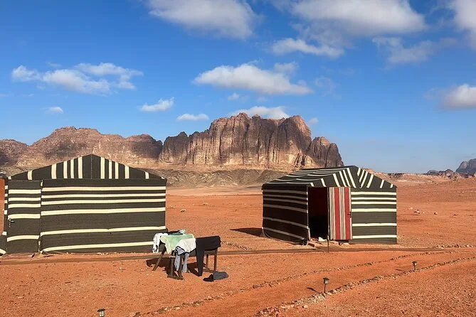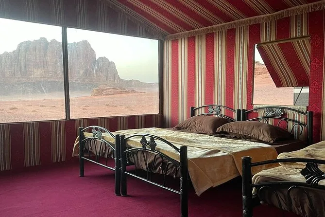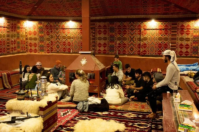 Your day includes transfer from Wadi Rum Village, bottled water throughout the trip, traditional lunch cooked over an open fire with your guide Ahmad (plus dinner and breakfast at camp), coffee or sweet Bedouin tea at several stops along the way, an overnight stay in a private tent at a Bedouin camp with thick blankets and mattresses for comfort before returning refreshed in the morning.