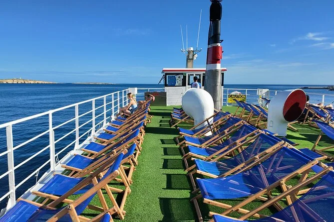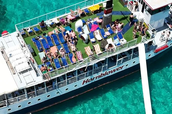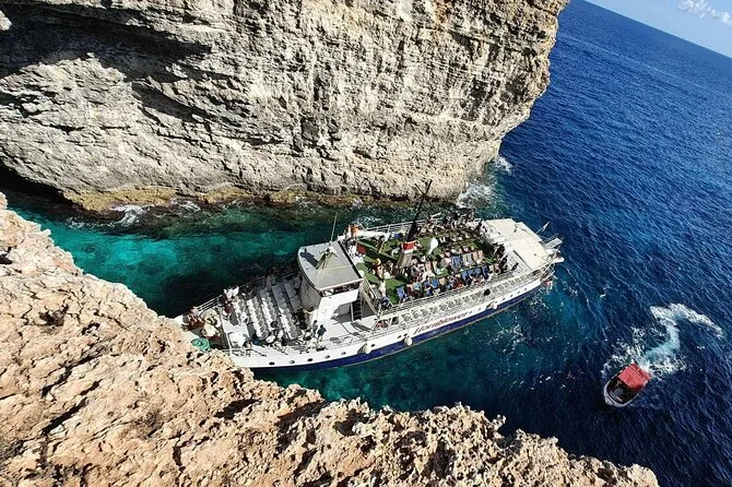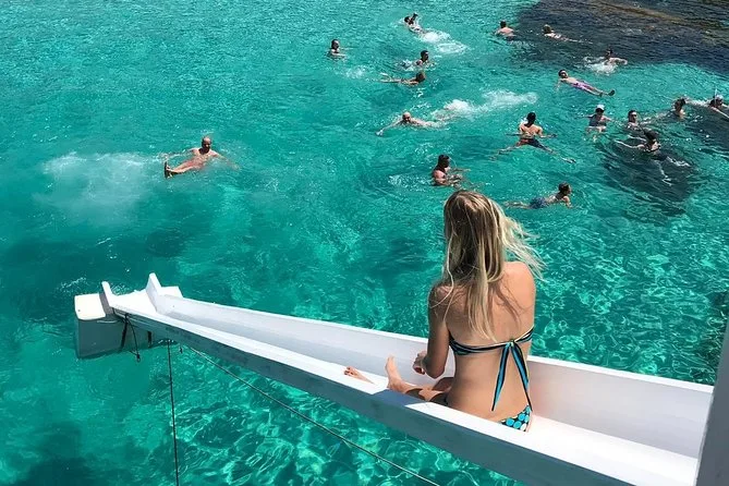 Your day includes all taxes and fees covered, free use of deck chairs (first come first serve), access to restroom facilities and slide onboard, plus landing fees for stops along Comino island. You’ll also have access to an air-conditioned bar/cafeteria for snacks or drinks whenever you want throughout your cruise.