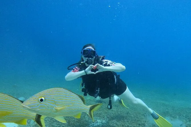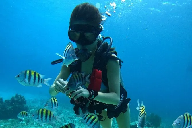 Your day includes entry to Chankanaab Park with full access to its beach area and loungers, one air tank for your introductory scuba dive led by a certified bilingual instructor, use of a locker per booking for your things, plus one free drink after diving—all wrapped up with time to relax or explore more of the park at your own pace.