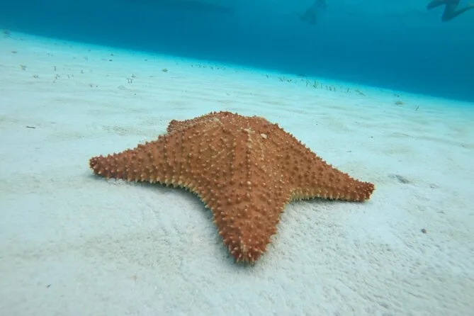 Next came the reef—alive with parrotfish and those tiny electric-blue damselfish darting everywhere. Ana handed me a piece of fresh pineapple between swims (she swears it keeps your mask from fogging up). Then we cruised south to El Cielo and El Cielito, where the sand feels powdery underfoot and starfish dot the shallows like orange polka dots. It’s quieter than I expected—just the slap of water against the hull and someone laughing about how cold the first dip feels.