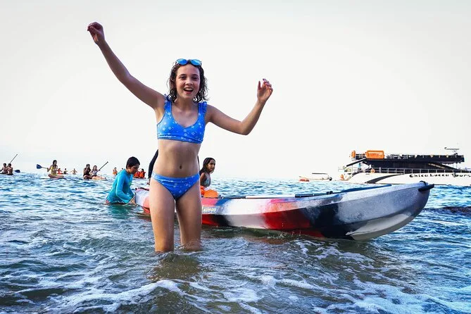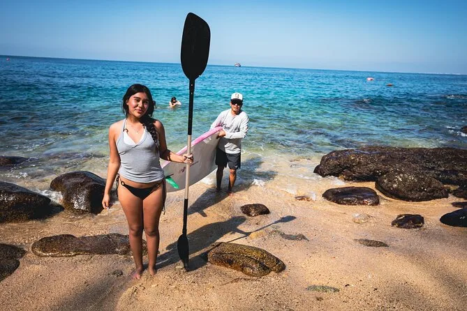 Your day includes breakfast snacks on board as you cruise from Puerto Vallarta by catamaran to Playa Chica Locca with all port entry fees covered. At arrival you’ll have unlimited access to an open premium bar (cocktails, wine, beer), fresh guacamole with blue corn chips as a welcome snack plus use of kayaks, paddleboards and snorkel gear all day long. Lunch features grilled fajitas (chicken or beef), rice and beans with tortillas—vegan and vegetarian options too—and there’s always shaded lounges or an infinity pool waiting when you need them most before cruising back at sunset.