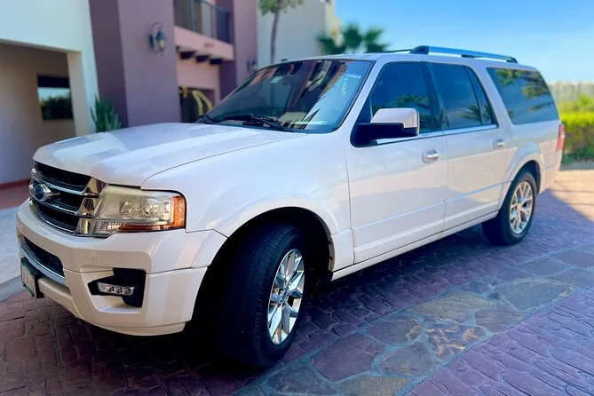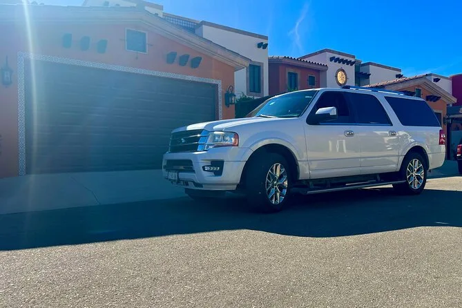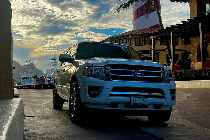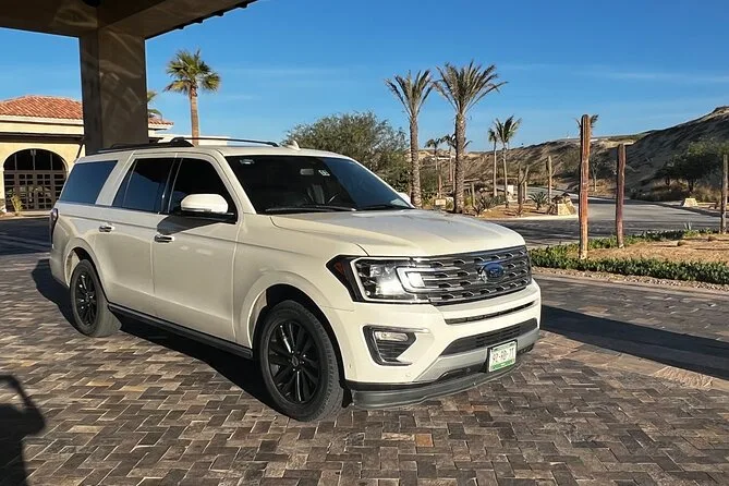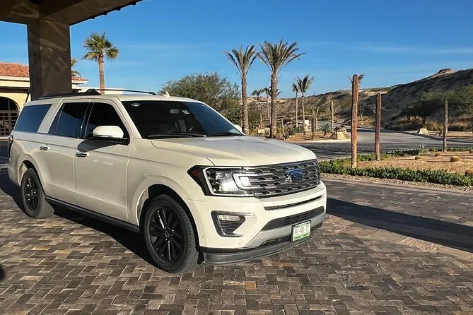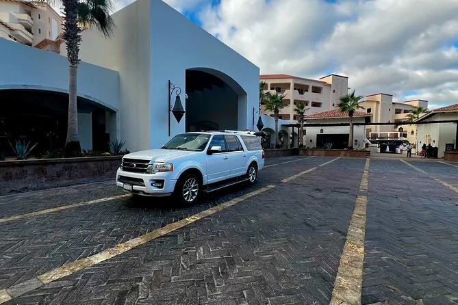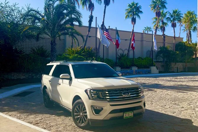 Your transfer includes private transportation from SJD Airport to Cabo San Lucas with pickup under tents 9-10 outside arrivals, bottled water and alcoholic beverages served onboard, an air-conditioned vehicle driven by a bilingual local driver—and everything is set up so you don’t have to worry about anything except finding your name on the sign when you arrive.