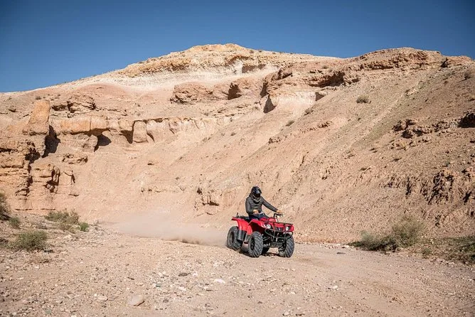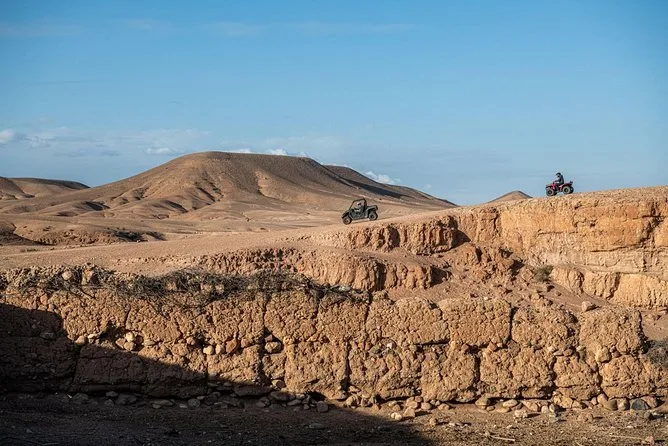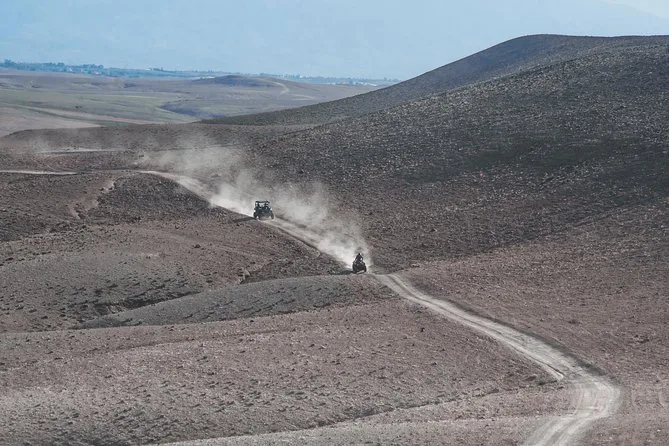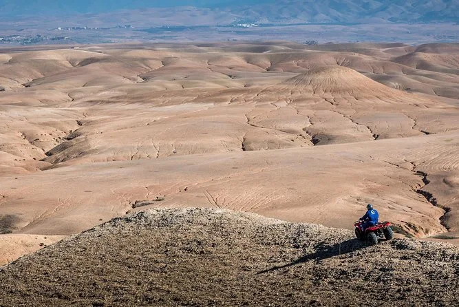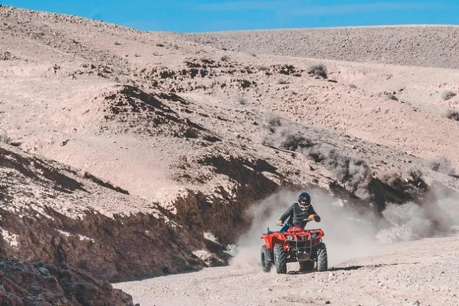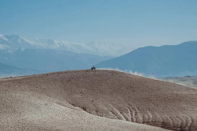 The quad bike tour itself was wild in a way I didn’t expect. The Agafay Desert isn’t all flat sand; it’s more like endless pale hills that look soft from far away but feel bumpy under your wheels. My hands got a bit shaky at first (I’m not exactly an off-road pro), but Youssef kept checking on us with these big gestures — thumbs up, waving us to slow down or speed up. At one point we stopped on a ridge and just looked out at the Atlas Mountains in the distance. It was quiet except for our engines ticking as they cooled. I still think about that view sometimes when I hear engines back home.