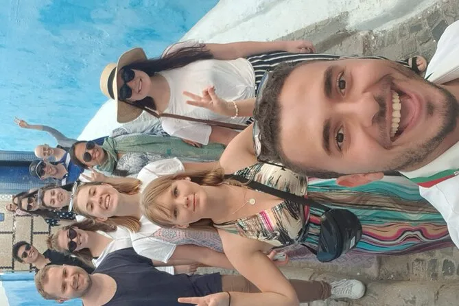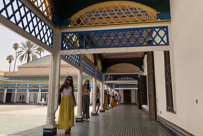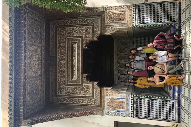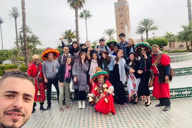The tour visits Koutoubia Minaret, Ben Youssef Madrasa, and Jemaa el-Fna square.