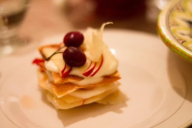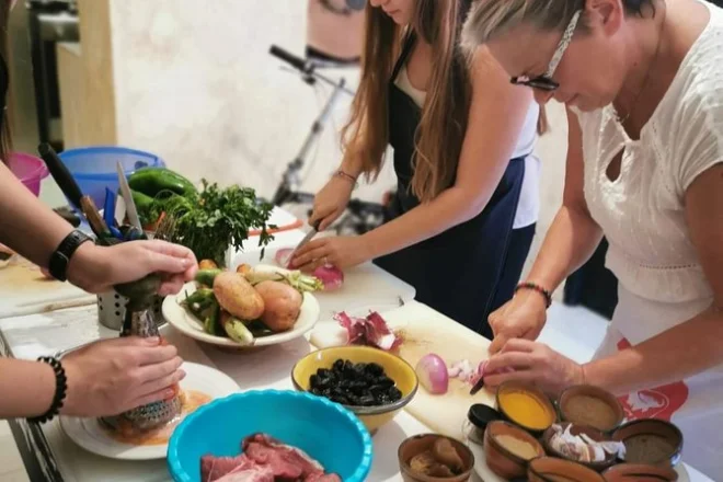 The main event was learning how to make a proper Moroccan tagine — I chose chicken with preserved lemon but kept sneaking glances at the lamb with prunes bubbling away on someone else’s stove. Najla moved between us, fixing our spice mixes (“more coriander!”), sometimes just watching us mess up and grinning. It wasn’t rushed; we took our time layering vegetables and tasting sauces until they felt right. By lunch, everything smelled rich and warm — I still think about that first bite of slow-cooked chicken with lemon peel melting into the sauce.