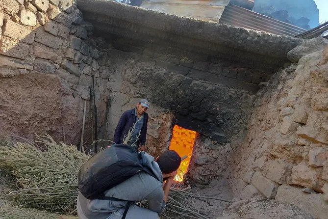 We stopped at a communal oven just as a woman slid fresh rounds of bread onto hot stones. The smell was warm and nutty, mixing with the sharp scent of olives set out for breakfast. Our guide poured sweet mint tea into little glasses while explaining how the ancient irrigation channels keep this whole oasis alive—he even showed us where cool water trickled underfoot, hidden by reeds. I’d never realized how much work goes into every green patch here.