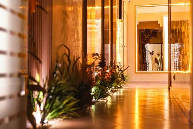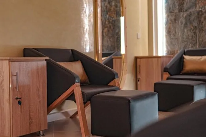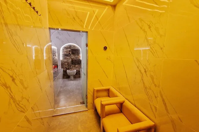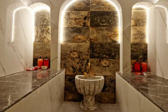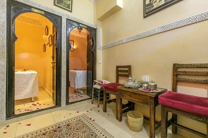 The spa experience includes admission to the steam room, towel use, black soap scrub with eucalyptus scent, and an argan oil massage.