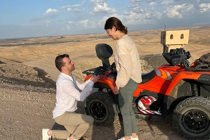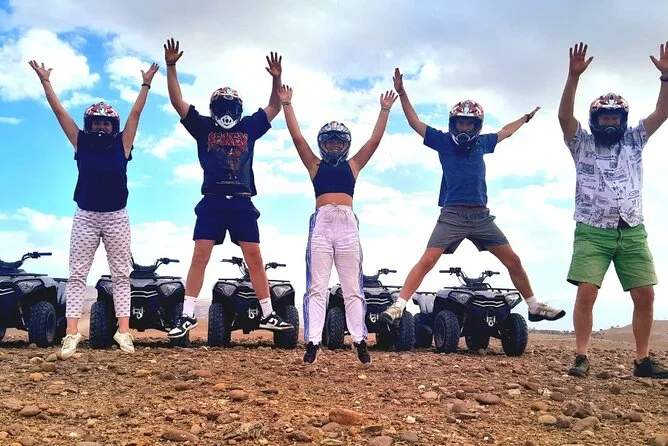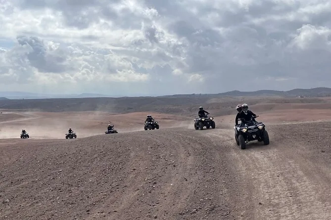 Your day includes pickup from your accommodation in an air-conditioned vehicle, use of a quad bike with helmet and safety gear (motocross glasses and hair cover), plus a traditional mint tea break served in a Berber tent before heading back toward Marrakech.