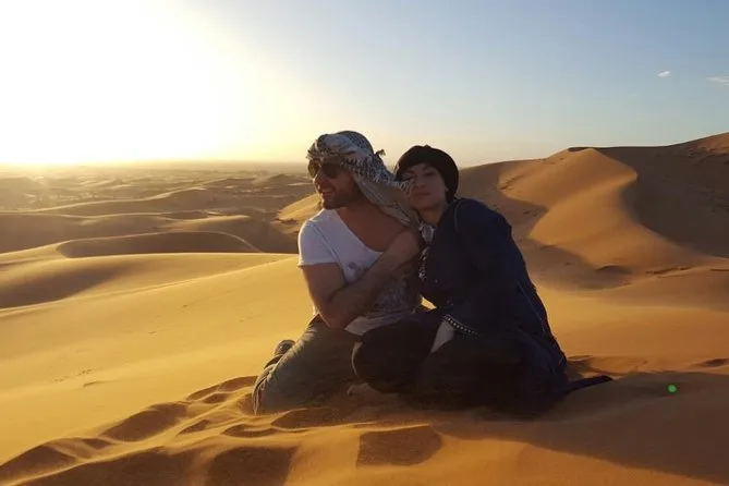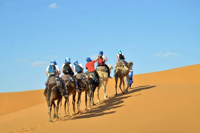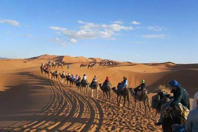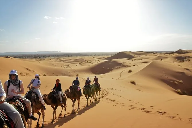 Your three days include pickup from your Marrakech hotel or riad, all transport by air-conditioned minibus with fuel covered, guided visits through oases and gorges near Tinghir, one night’s stay at Hotel Bougafer (or similar), another night camping in Merzouga’s Berber tents (La Source Camp or similar), camel rides at both sunset and sunrise across Erg Chebbi dunes, plus breakfast and dinner each day—just let them know if you need vegetarian meals when booking.