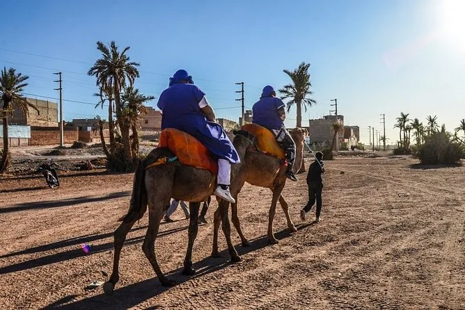 Your hotel pickup and drop-off are covered. We provide all equipment: helmets, masks, and traditional blue camel clothing for comfort. Mint tea with bread and honey is also included during your visit to a local home.